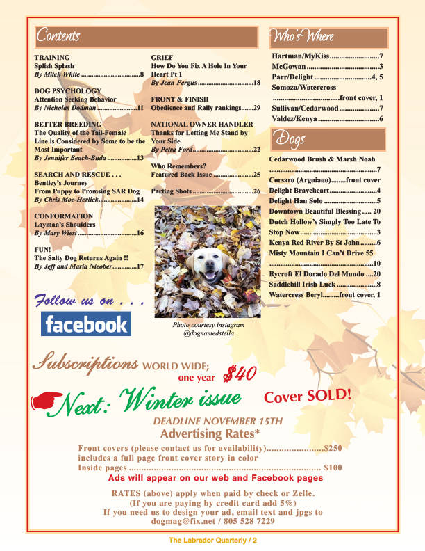 …the Labrador magazine is read and referenced by fanciers worldwide – and – complimentary issues are sent to judges. It offers articles on all aspects of Labrador care. Every Labrador lover will appreciate the Labrador Quarterly magazine, all chock full of helpful articles, advice, tips, useful listings, and information from breeders, judges and handlers.